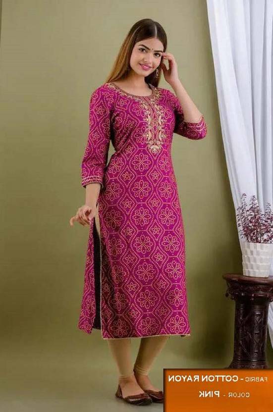 BAGDA BAZAAR Women Bandhani Cotton Rayon Straight Kurta (Pink)