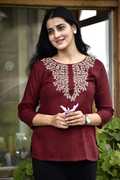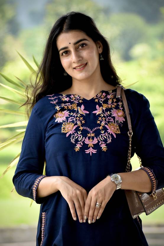 दिस कुर्ता इज़ डिज़ाइंड विथ ए स्ट्रेट कट, मेकिंग इट ए वर्सेटाइल एंड फ्लैट्टरिंग ऑप्शन फॉर मेनी बॉडी टाइप्स. ईट्स मेड फ्रॉम रेयॉन, ए फैब्रिक नोन फॉर इट्स सॉफ्टनेस एंड ड्रेप, व्हिच ऐड्स ए कम्फर्टेबल एंड फ्लॉवी एलिमेंट टू द गारमेंट. द एम्ब्रॉयडरी डिटेल्स आर लाइकली टू बी ए की फीचर, ऐडिंग ए टच ऑफ एलिगेंस एंड क्राफ्ट्समैनशिप. रेयॉन इज़ ऑल्सो नोन फॉर इट्स ब्रेथेबिलिटी, सो दिस कुर्ता कुड बी ए गुड चॉइस फॉर वार्मर वेदर ऑर फॉर लेयरिंग इन कूलर क्लाइमेट्स. इट कैन बी पेयर्ड विथ लेगिंग्स, चूड़ीदार्स, ऑर इवन जींस फॉर ए मॉडर्न ट्विस्ट ऑन ट्रेडिशनल स्टाइल.