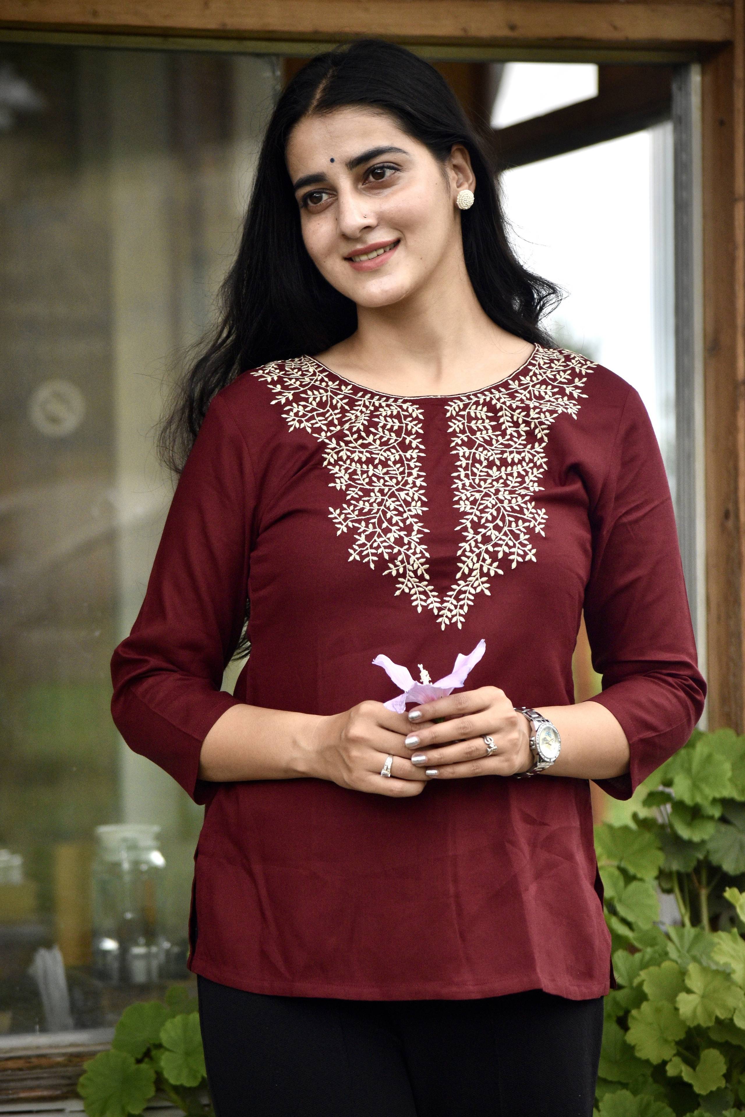 दिस कुर्ता इज़ डिज़ाइंड विथ ए स्ट्रेट कट, मेकिंग इट ए वर्सेटाइल एंड फ्लैट्टरिंग ऑप्शन फॉर मेनी बॉडी टाइप्स. ईट्स मेड फ्रॉम रेयॉन, ए फैब्रिक नोन फॉर इट्स सॉफ्टनेस एंड ड्रेप, व्हिच ऐड्स ए कम्फर्टेबल एंड फ्लॉवी एलिमेंट टू द गारमेंट. द एम्ब्रॉयडरी डिटेल्स आर लाइकली टू बी ए की फीचर, ऐडिंग ए टच ऑफ एलिगेंस एंड क्राफ्ट्समैनशिप. रेयॉन इज़ ऑल्सो नोन फॉर इट्स ब्रेथेबिलिटी, सो दिस कुर्ता कुड बी ए गुड चॉइस फॉर वार्मर वेदर ऑर फॉर लेयरिंग इन कूलर क्लाइमेट्स. इट कैन बी पेयर्ड विथ लेगिंग्स, चूड़ीदार्स, ऑर इवन जींस फॉर ए मॉडर्न ट्विस्ट ऑन ट्रेडिशनल स्टाइल.