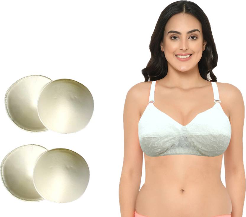Mastectomy Cancer Pocket Bra Embroidery Pure Cotton-1 Bra With 2 Pair of Push Up Cups-White (Size-40)