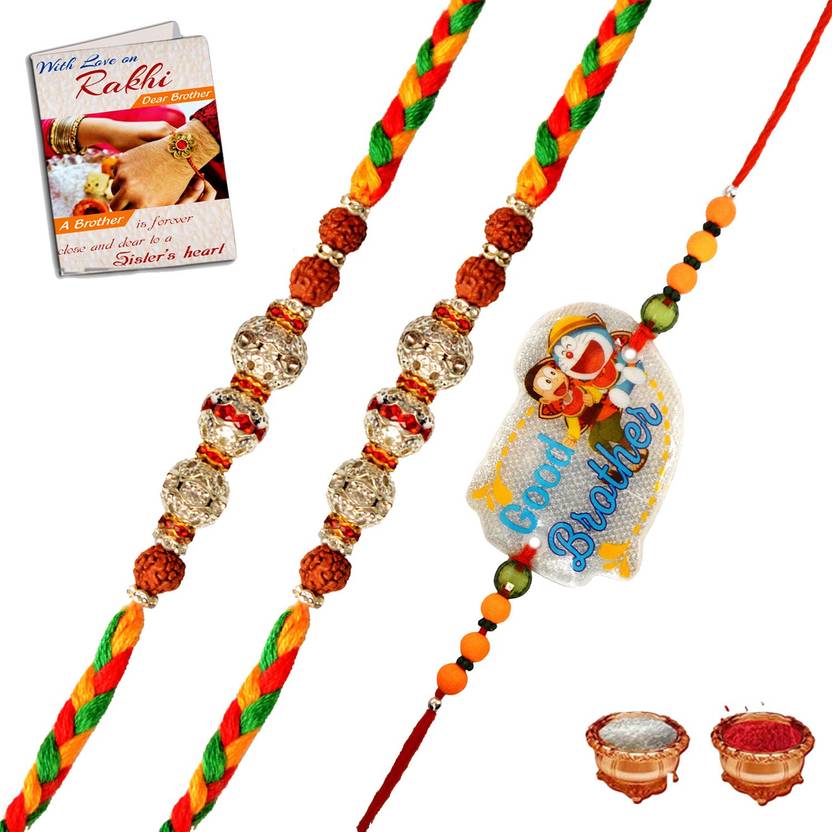 2 Designer Rakhi for Brother, 1 Cartoon Rakhi For Kids, 1 Greeting Card, 1 Roli Chawal Pack