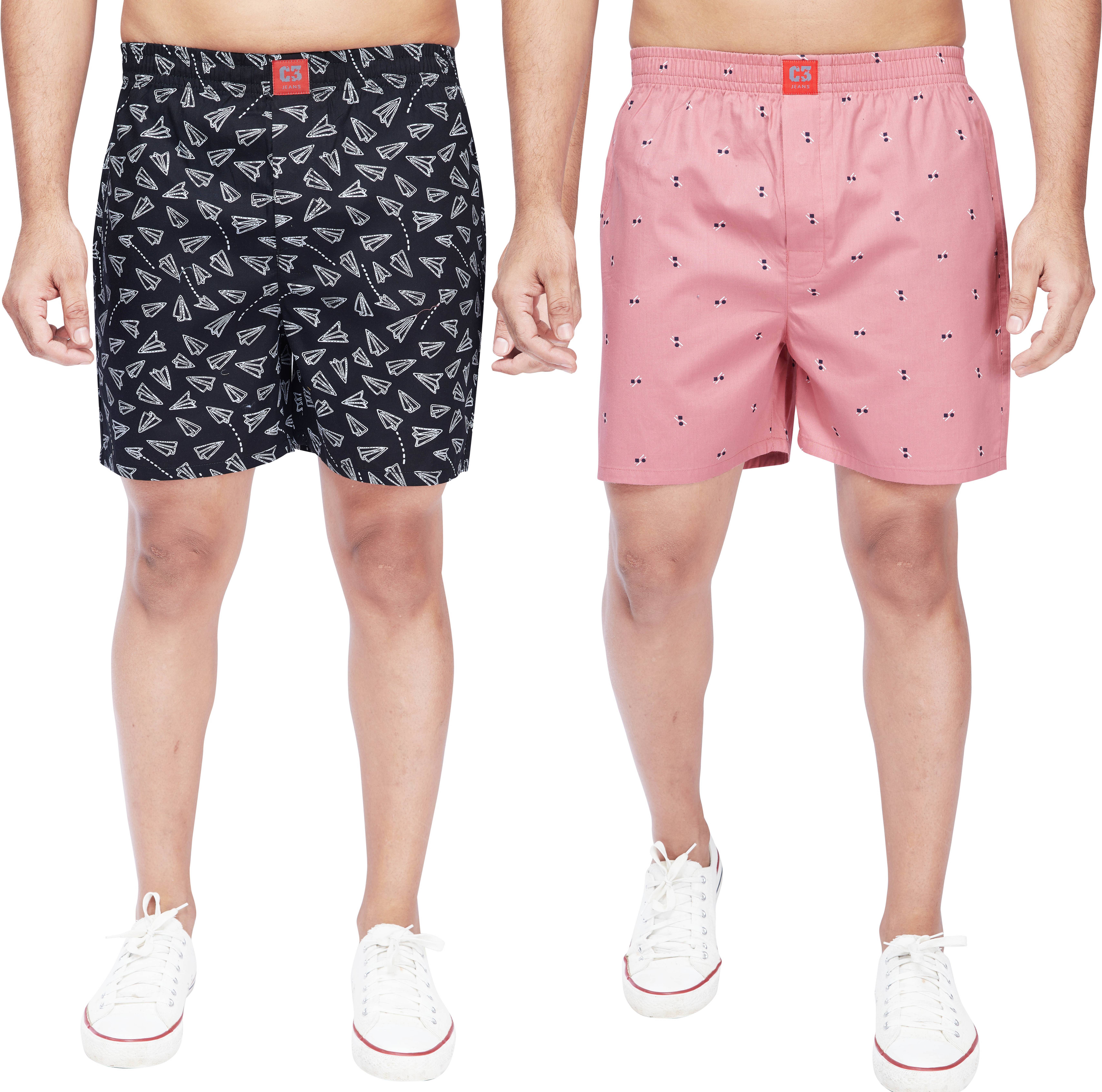 Bubblegum Pink & Coal Black, 100% Cotton Printed boxer shorts for men. Single pocket at the back with button for carrying essentials & front fly with button for easy access. Superior quality cotton fabric that feels soft to the skin and is comfortable for long hours. Intelligent fit that makes it possible to wear it as a standalone shorts or inner-wear, whatever you prefer.