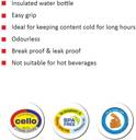 Capacity and Material: The Cello Puro Striker 600 is a 510ml water bottle crafted from BPA-free plastic, ensuring your child's safety while enjoying their drinks. Trendy Personalization: With Striker prints and a variety of vibrant colors to choose from, your child can showcase their unique style while staying hydrated. It's not just a bottle; it's an accessory! Insulated for All-Day Refreshment: This bottle is designed to keep beverages cold, making it the ideal choice for school-going kids. Whether it's a long day at school or a fun-filled picnic, your child's drinks will stay refreshingly chilled. Convenient and Leak-Proof Design: The flip-top lid with a covered sports mouth ensures spill-free sipping, and the integrated wrist strap makes it easy to carry. No more worries about leaks or spills in your child's bag. Hydration on the Go: Equipping your child with the Cello Puro Striker means they can stay hydrated wherever they go, ensuring their well-being and energy levels remain at their best.
