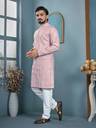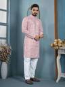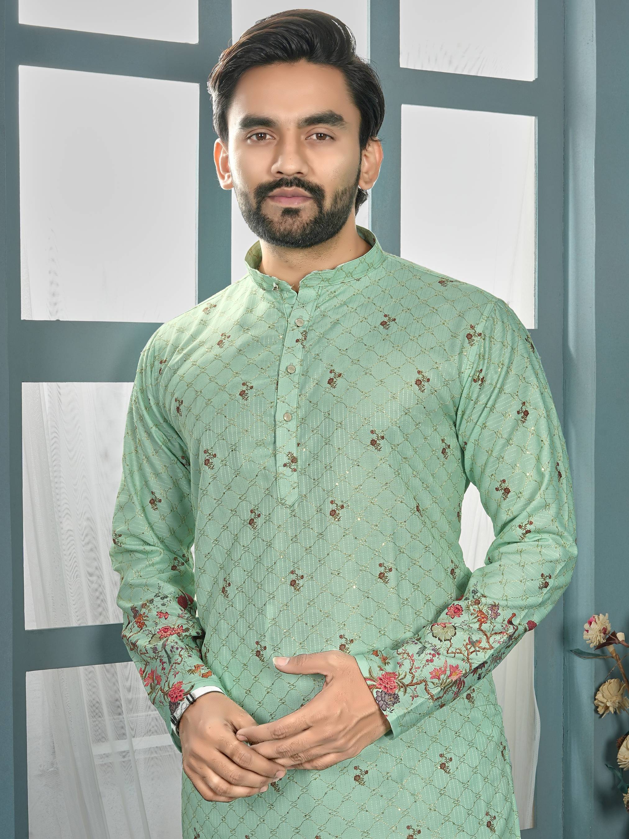 Add a touch of elegance to your festive and traditional wardrobe with this stylish men's kurta pyjama set. Crafted from premium quality fabric, this kurta features a beautiful all-over embroidered pattern with a mandarin collar and buttoned placket for a classy ethnic look. The matching pyjama ensures comfort and completes the traditional outfit. Ideal for festivals, weddings, functions, and special occasions.