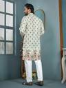 Elevate your ethnic wardrobe with this elegant men’s printed kurta, designed to offer a perfect blend of traditional charm and modern style. Crafted from comfortable and breathable fabric, this kurta features an all-over subtle motif print with a beautifully detailed floral border at the hem and sleeve cuffs, giving it a rich and festive look.