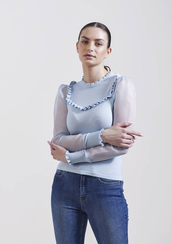 BLUE V NECK PULLOVER FEATURING LONG ORGANZA PUFFED SLEEVES
