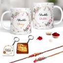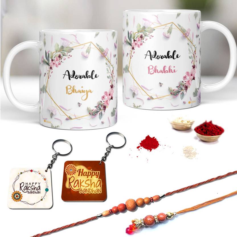 Gifts For Brother, Bhaiya Bhabhi Rakhi Set, 2 Coffee Mug, 2 keychain, Roli chawal, Card