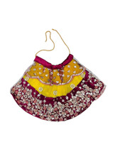 The poshak comprises a complete set including a lehenga, a choli, as well as a chunari. Therefore, it has a coordinated look that can be suitable for your home temple set-up. Constructed in a tie-up style, the dress has strings that you can use to conveniently drape it on your idol with the right fit.