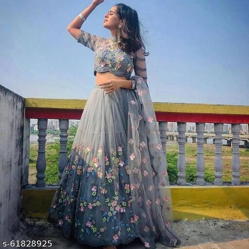 एम्ब्रॉइडर्ड सेमी स्टिच्ड लेहंगा चोली (ग्रे)