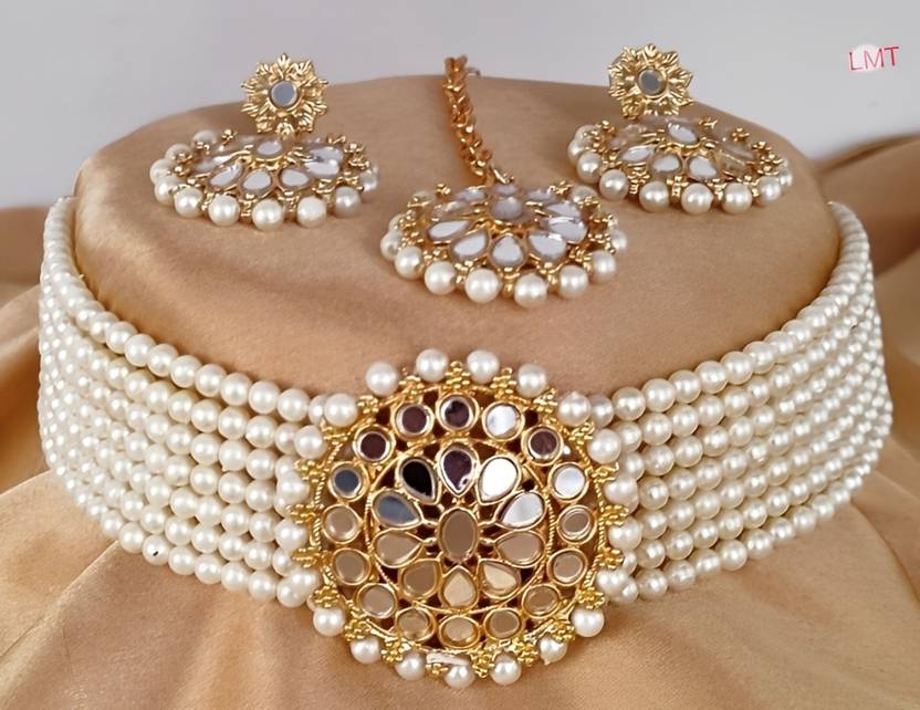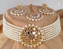 Enhance your traditional elegance with this exquisite Kundan Polki Choker Necklace Set, a perfect blend of regal charm and modern sophistication. Crafted with premium gold-plated alloy, adorned with hand-set Kundan stones, and completed with lush white pearl beads, this choker set is designed for brides, wedding guests, and festive celebrations. The intricate craftsmanship and high-quality finishing make it a timeless piece that complements sarees, lehengas, and ethnic outfits effortlessly.