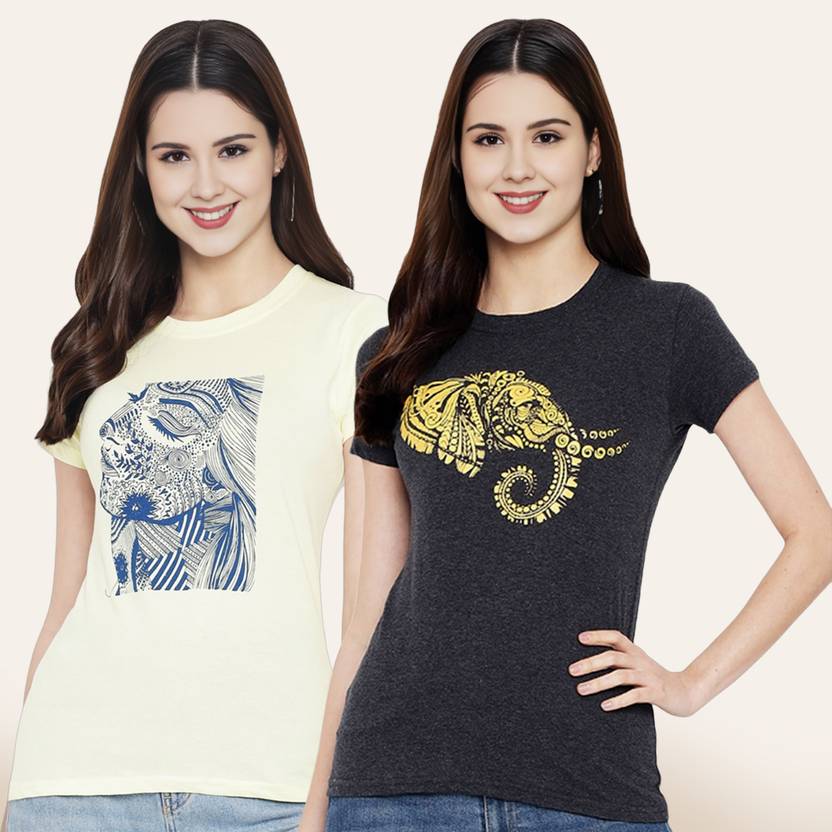 DreamBe Pack of 2 Women Printed Round Neck Pure Cotton Multicolor T-Shirt