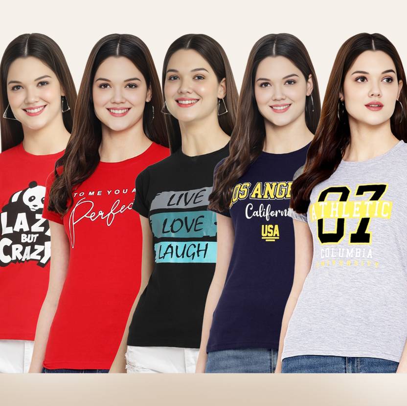 DreamBe Pack of 5 Women Printed Round Neck Pure Cotton Multicolor T-Shirt