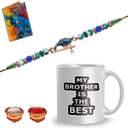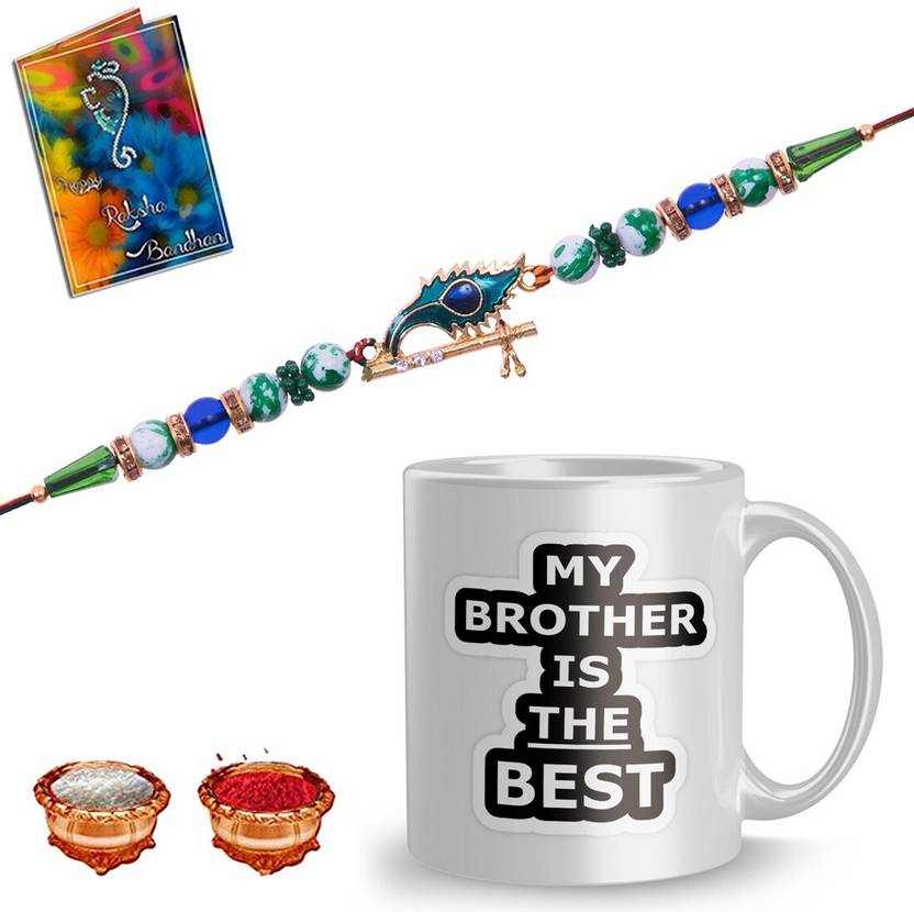 1 Rakhi, 1 Mug, 1 Chawal Roli Pack, 1 Greeting Card