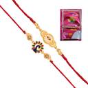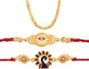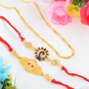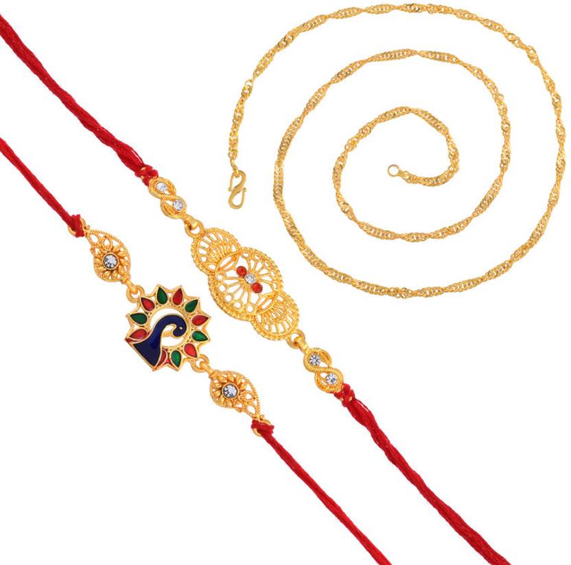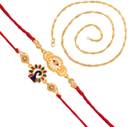 डेज़िनेट्रेंड्ज़ भैया भाभी 3 Rakhi Set Rakshabandhan Combo for Bhai Bhabhi with Goldplated chain(Pack of 3) यार्न, गोल्ड फिनिश, कुंदन सेट (2 राखीस, 1 चेन)