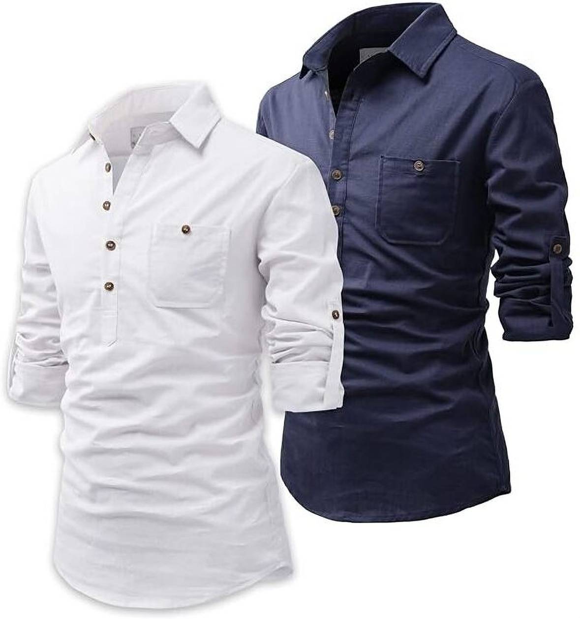 Men Solid Cotton Blend Straight Kurta (Dark Blue, White)
