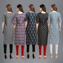 Round-neckline and ¾ length sleeves for a relaxed fit. Features contrast print, lightweight kurta woven in a soft and premium crepe fabric for everyday wear,Classic colour with beautiful Ethnic Motif print .Straight fit cut with side slits and panels render a stylish print. Size- S, M, L, XL, XXL.