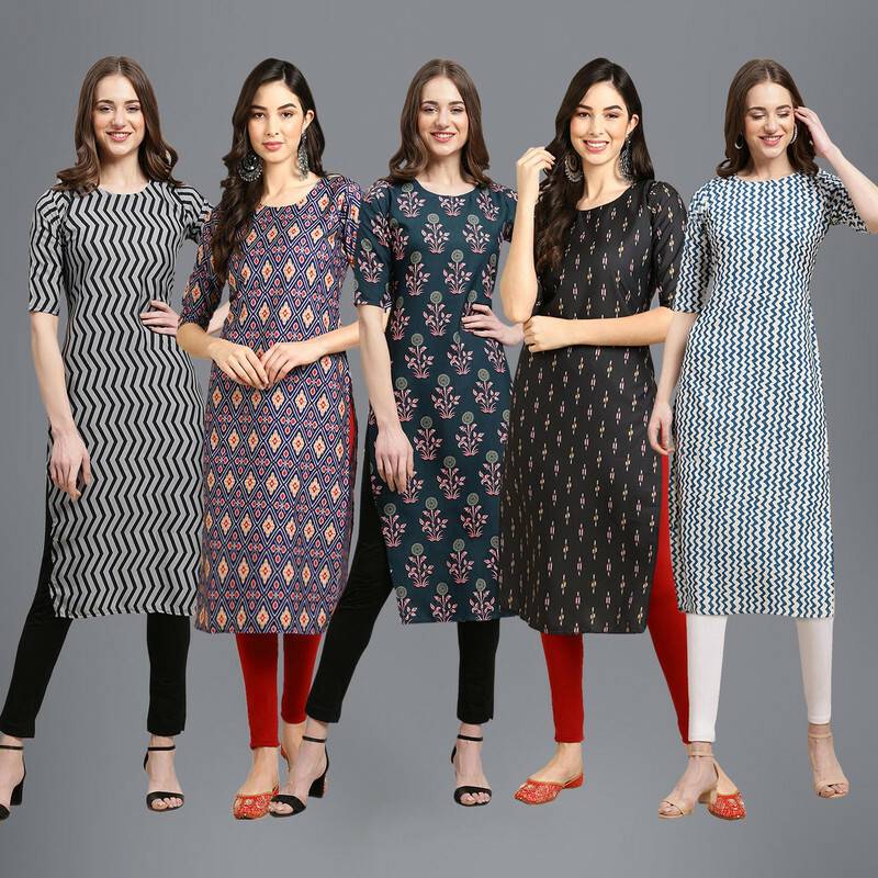 EthnicBasket Pack of 5 Women Printed Crepe Straight Kurta (Multicolor)