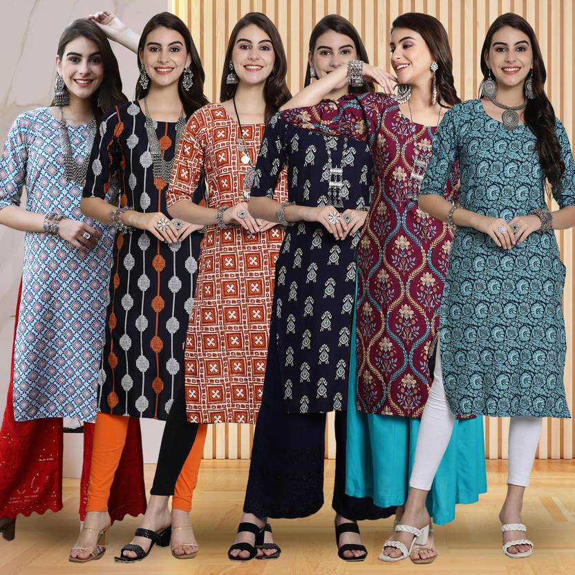 Pack of 6 Women Printed Crepe Straight Kurta (Multicolor)