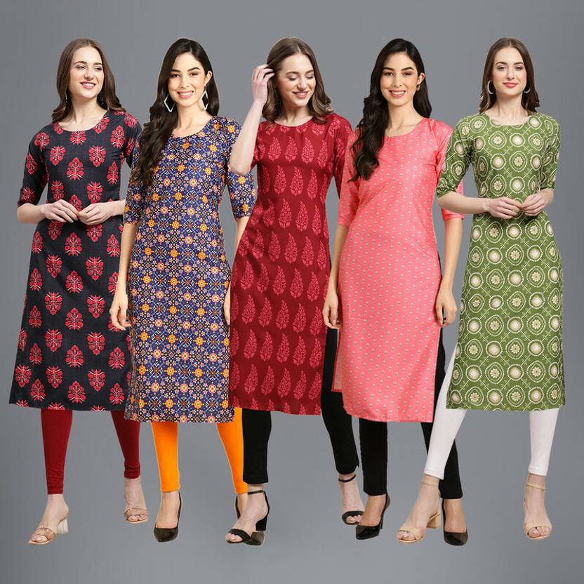 EthnicBasket Pack of 5 Women Printed Crepe Straight Kurta (Multicolor)