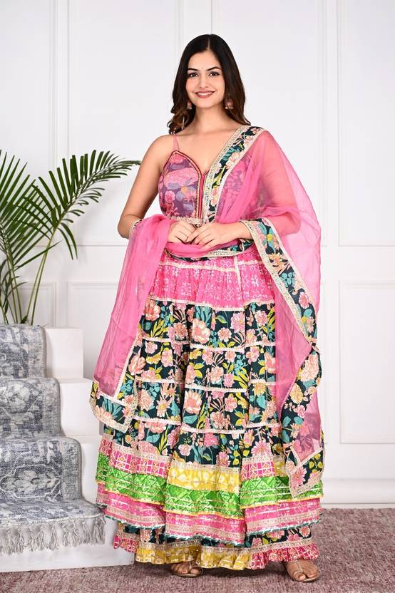 The sounds like a vibrant and stylish Anarkali side cut sharara set with a Pink colour and multi-colour accents. The organza dupatta likely adds a touch of elegance to the ensemble. Great Choice!