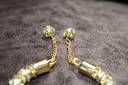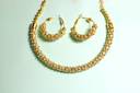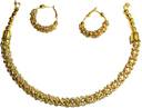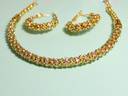The matching earrings and bracelet feature the same design elements as the necklace, including the gold-tone metal base and green crystal accents. The earrings may be in a stud or drop style, depending on the specific design, and are typically lightweight and comfortable to wear. The bracelet is designed to match the necklace and earrings, featuring a similar design and metal base with a comfortable and adjustable fit.