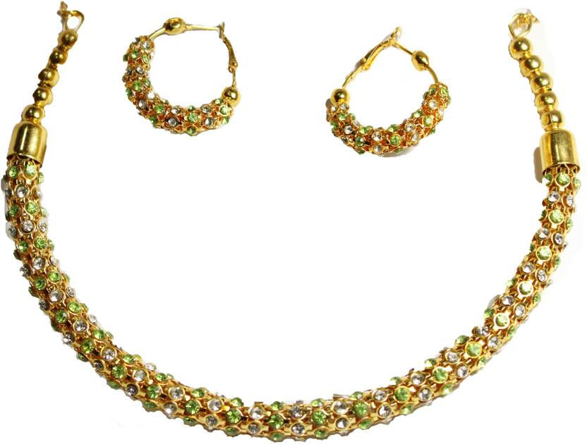 The choker necklace features a gold-tone metal base that is plated with a layer of gold for a shiny and lustrous look. The necklace is designed to fit around the neck, creating a flattering and elegant look. It is adorned with green crystals, which are carefully and intricately set into the metal base to add a touch of sparkle and glamour.