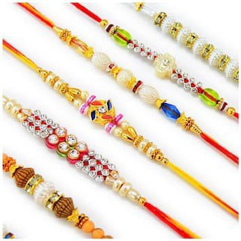 FINWIN Designer B1D67 Gold Finish Rakhi, Chawal Roli Pack Set (6 Rakhi, 1 Roli Chawal Pack)