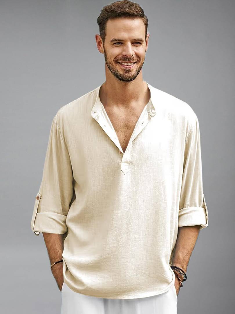 Men Solid Cotton Blend A-line Kurta (Beige)