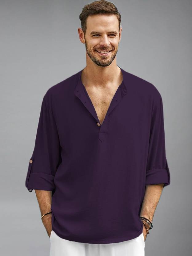 FireFish Men Solid Cotton Blend A-line Kurta (Purple)