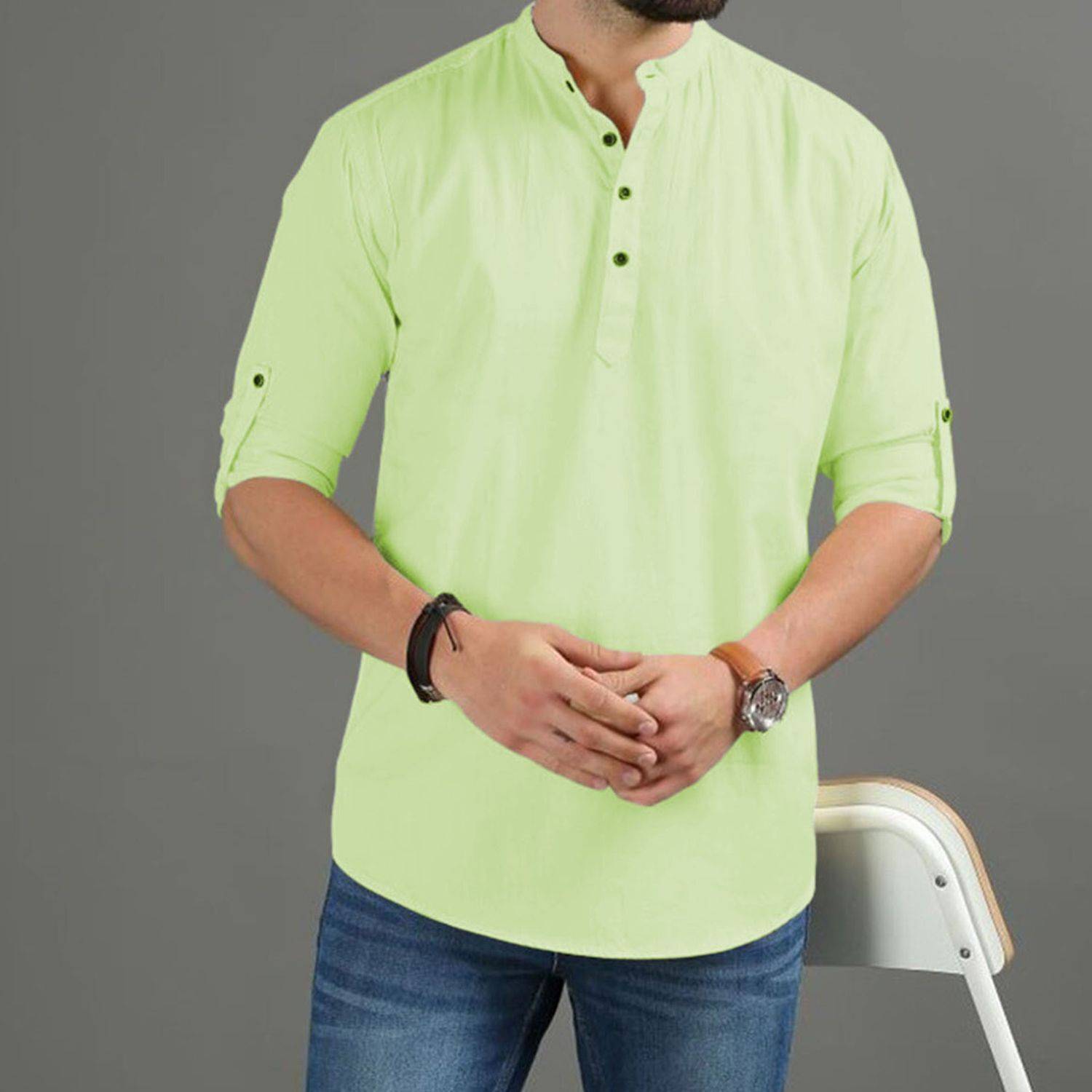 This pure cotton beige short kurta is perfect for men who value style and comfort. Its versatile design makes it ideal for any occasion—festivals, parties, or casual outings. Product Details 📋 👨‍🦰 Gender: Men 🎨 Pattern: Solid 🧵 Design Type: Plain 🔘 Closure: Button 👕 Sleeve: Full Sleeve (Roll-Up Option) ⬆️ Waist Rise: Mid-Rise 🪡 Collar: Mandarin/Chinese ✂️ Hemline: Curved 🌿 Fabric: Pure Cotton 📏 Product Length: Short 📦 Pack of: 1 Material & Care 🧺 Fabric: 100% Cotton Wash: Suitable for hand wash and machine wash. How to Style 🎯 Pair it with dark-wash denim or linen trousers for a casual look. Dress it up with a pair of churidar or slim-fit pants for festive occasions. Add leather sandals or loafers and a wristwatch for a classy finish. Roll up the sleeves for a relaxed vibe during daytime events. This short kurta seamlessly blends traditional elegance with modern styling, making it a wardrobe essential for every man! 👌