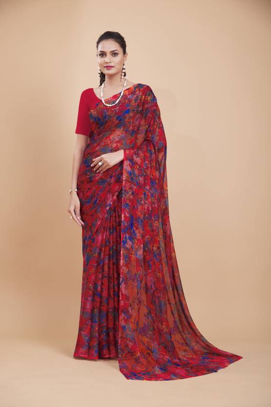 GARDEN VARELI Floral Print, Graphic Print Bollywood Chiffon Saree (Red)
