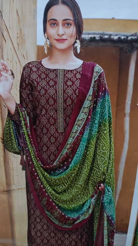 This stylish suit piece, made up of fine quality Pashmina yarn will keep you warm this winter season and will give you an elegant look The Fabric is very skin friendly and comfortable to wear.It features Beautiful embroidery work on front along the Neckline as shown in pics. It is an all over running fabric measuring 2.5 meter with plain woollen matching stole of 2.5 meters .Over all the look of the suit is quiet exceptional, It is a must have in your wardrobe.