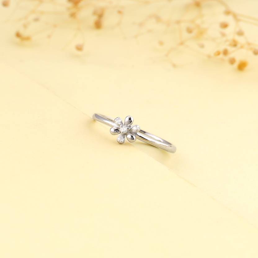 दिस सिल्वर रिंग फीचर्स ए फ्लोरल डिज़ाइन विथ इट्स ओल्टर्नेटिंग पेटल्स सेट विथ ज़रकन्स.