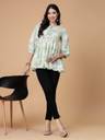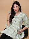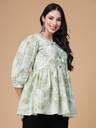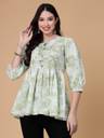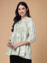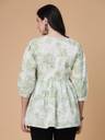 ब्लूमिंग फ्लोरल प्रिंट के साथ अनोखा रंग, यह टॉप आपको कमर पर सही तरह से फिट होगा और सही मात्रा में फ्लेयर देगा! एलिगेंट समर लुक के लिए इसे फ्लैट्स और सटल ज्वैलरी के साथ पेयर करें। हल्के हरे रंग के रेगुलर पेप्लम टॉप्स फ्लोरल प्रिंट राउंड नेक, थ्री-क्वार्टर, 3/4 स्लीव्स गैदर या प्लीटेड डिटेल वोवन राउंड नेक
