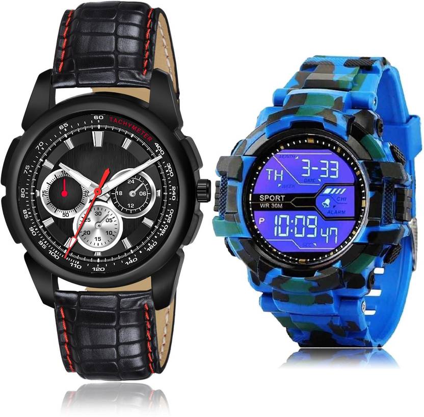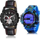 Dial Colour : Black And White ; Band Colour : Black And Blue ; Case Shape : Round ; Band Material : Genuine Leather And Resin ; Case Diameter : 43 And 55 mm ; GROOT Modish Formal casual and army digital sports Black And Blue Colour Analog-Digital Genuine Leather And Resin Belt 2 Watch Combo For Boys And Men - S314-BC16