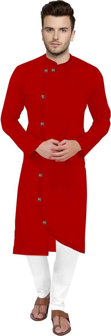 Men Solid Cotton Linen Asymmetric Kurta (Red)