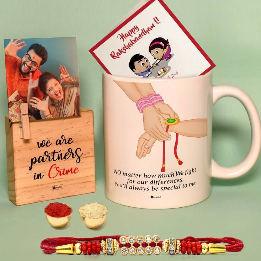 डिजाइनर D-CM115-RKH16014 असोर्टेड सेट (1 फोटो मैग्नेटिक फ्रेम, 1 प्रिंटेड कॉफ़ी मुग, 1 राखी, 1 ग्रीटिंग कार्ड)