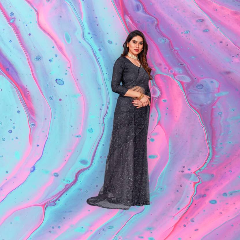 InfiniteFab Solid/Plain Daily Wear Georgette Saree (Black)
