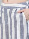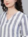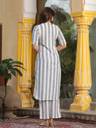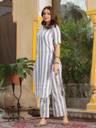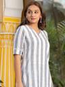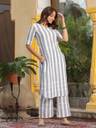 सफेद और नीला स्ट्राइप्ड कुर्ता और पलाज़ो सेट कॉटन यार्न-डीड फैब्रिक से बना है। सफेद और नीला स्ट्राइप्ड कुर्ता लैडर लेस डिटेल, एक स्ट्रेट हेम के साथ आता है, और इसमें वी नेक है। सफेद और नीले धारीदार पलाज़ो में साइड पॉकेट और आंशिक रूप से लोचदार कमरबंद है
