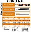 * Material: * The screwdriver Bits are made of high quality CR-V steel, high hardness and good toughness. Finest CR-V bits with HRC up to 52°. Features: * Ergonomic and Non-Slip Handle made of PP & TPR Material with softer encapsulation. The Handle equips with strong magnetic coupling can effectively attach the bits and so not easy to drop out. * 100mm Magnetic Extension Bar with strong magnetic coupling can effectively attach the bits and so not easy to drop out. * 118mm Curved Tweezer design, helps to easily pick up the small accessories from narrow places. * Accessories Includes: H4 100mm Extension Bar, Curved Tip Tweezer and Non-slip Handle * Bit Includes - Torx: T3, T4, T5, T6, T7, T8, T9, T10, T15, T20 * Slotted: 1.5, 2.0, 2.5, 3.0, 3.5 *1.5, 2.0, 2.5, 3.0, 3.5 * Hex: H1.3, H1.5, H2.0, H2.5, H3.0, H4.0 * Tri-wing: Y2.0 Triangle: 2.0 * Pentalobe (Star): 0.8 * U-shape: U2.6 * Strong and shockproof ABS box protects the tools. * Suitable for: Home appliance, furniture, machine, car repair. Common used in precision work in electronics, DIY models, jewelry, eye glasses and other home appliances.