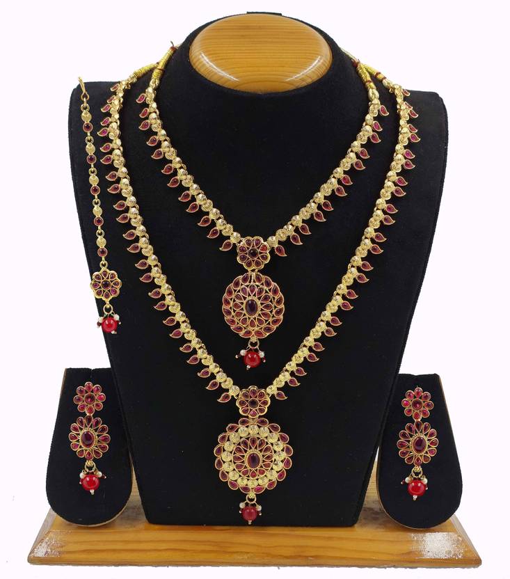 JEWELS HUB PRESENT BRASS MADE GOLD PLATED PACK OF TWO NECKLACE SET WITH EARRINGS AND MANG TIKA, LITE WEIGHT JEWELLERY, IT CAN BE WEAR IN ALL FUNCTIONS LIKE WEDDING ENGAGEMENT PARTY FSTIVAL ETC.