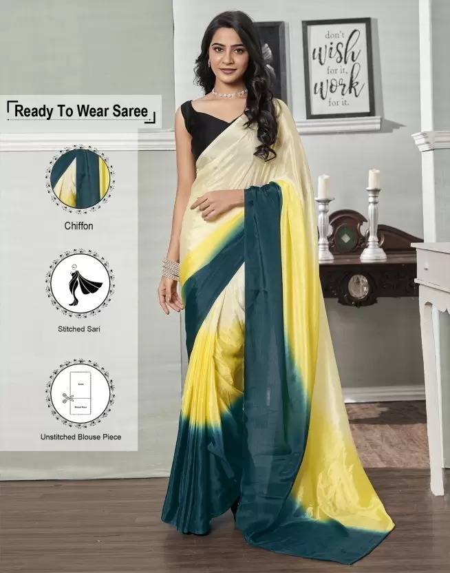 Discover A Stunning Assortment Of Beautifully Crafted Sarees At Jilani Sarees On Flipkart.Saree Fabric: Chiffon & Blouse Fabric: Silk Blend :: Saree Color: Cream, Peach, Rama Blue & Blouse Color: Black :: Saree Work: Dyed (Padded) (Ready To Wear) & Blouse Work: Dyed :: Saree Length: 5.50Mtr & Blouse Length 0.80Mtr
