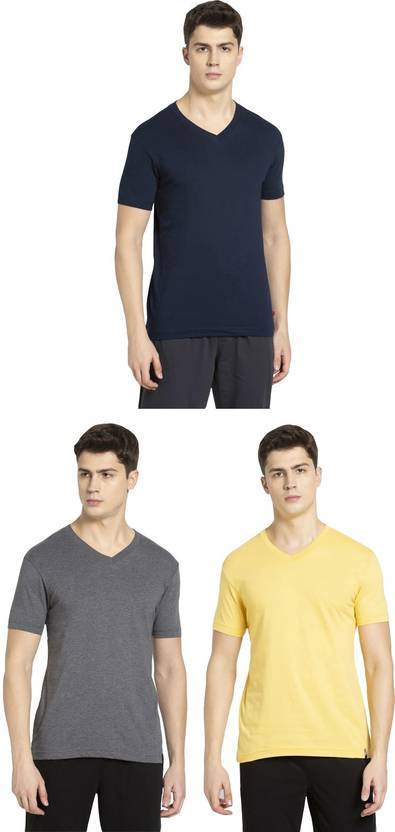 Jockey Athleisure Men Solid/Plain Multicolor827 V Neck Half Sleeve T-Shirt - Pack of 3 (#2726). Material Composition : 80% Cotton, 20% Polyester. Super combed Cotton Rich fabric. Ribbed round neck to prevent sagging. Regular fit. Label free for all day comfort. S=80-85 cm (32-34 inch), M=90-95 cm (36-38 inch), L=100-105 cm (40-42 inch), XL=110-115 cm (44-46 inch), XXL=120-125 cm (48-50 inch)