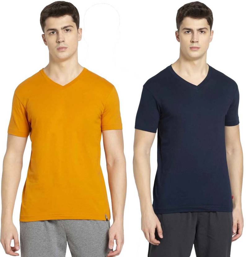 JOCKEY Pack of 2 Men Solid V Neck Pure Cotton Yellow, Dark Blue T-Shirt