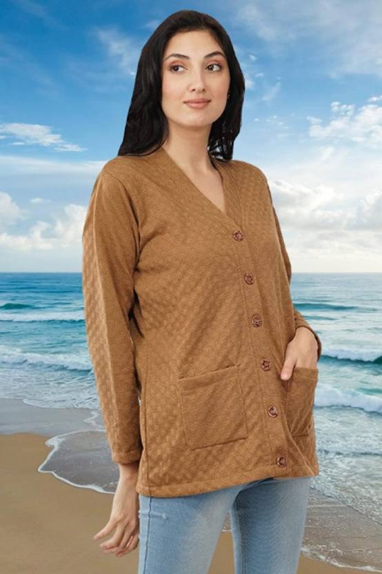 Women Solid, Self Design V Neck Beige Sweater