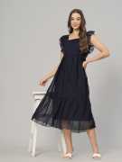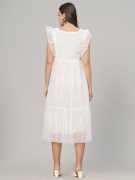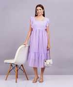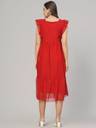 Radiate charm in this Red women's dress, adorned with cap sleeves featuring delightful frills. Crafted from airy poli crape or dobby fabric, it gracefully falls to calf length with a flattering flair. The dress is enhanced by a smooth rayon inner lining for comfort. A chic square neck completes the look, making it a perfect ensemble for any occasion with its blend of style and grace.