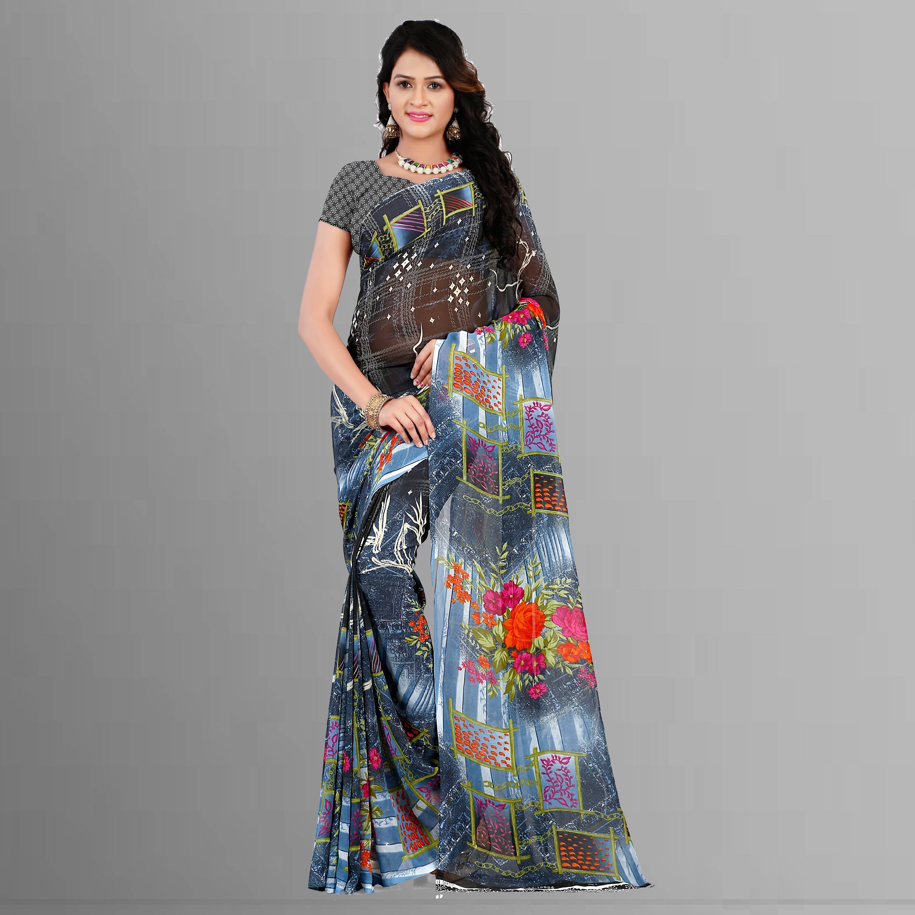 Printed Daily Wear Georgette Saree (Blue, Grey)