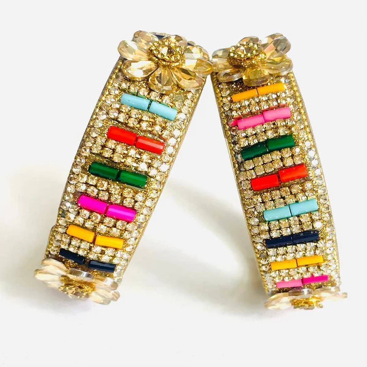 The vibrant hues of the crystals, combined with the sparkling floral centerpiece, create a playful yet elegant look. Perfect for festive occasions, casual gatherings, or adding a touch of bohemian flair to your style, these bangles are sure to turn heads and brighten your day.