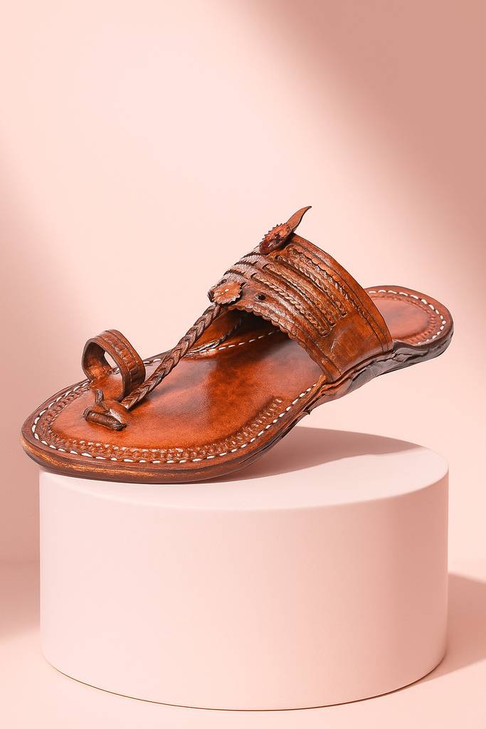 Every pair of Kolhapuri chappal for men is meticulously handcrafted using pure, high-quality leather sourced from ethical tanneries. The intricate braiding, hand-stitching, and natural polish reflect the dedication of artisans who have perfected this craft over generations.