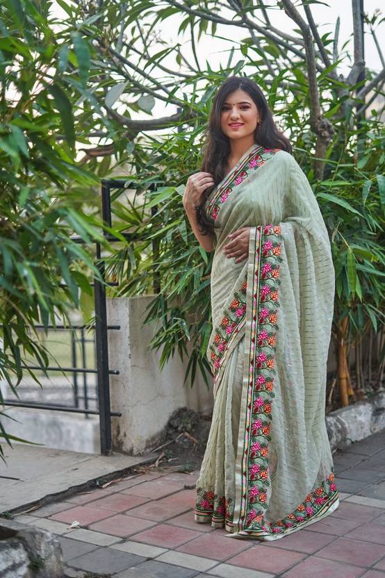 Soft georgette saree with seqwance work & multicolour embroidery c pallu work with satin lace border with Blouse Pcs